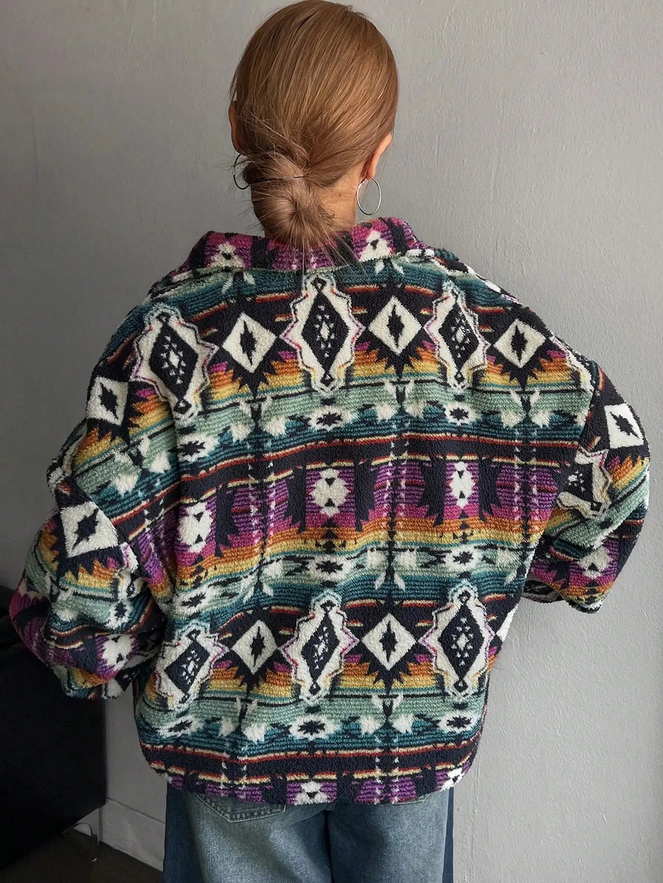 Boho Print Fuzzy Zip-Up Jacket for Women